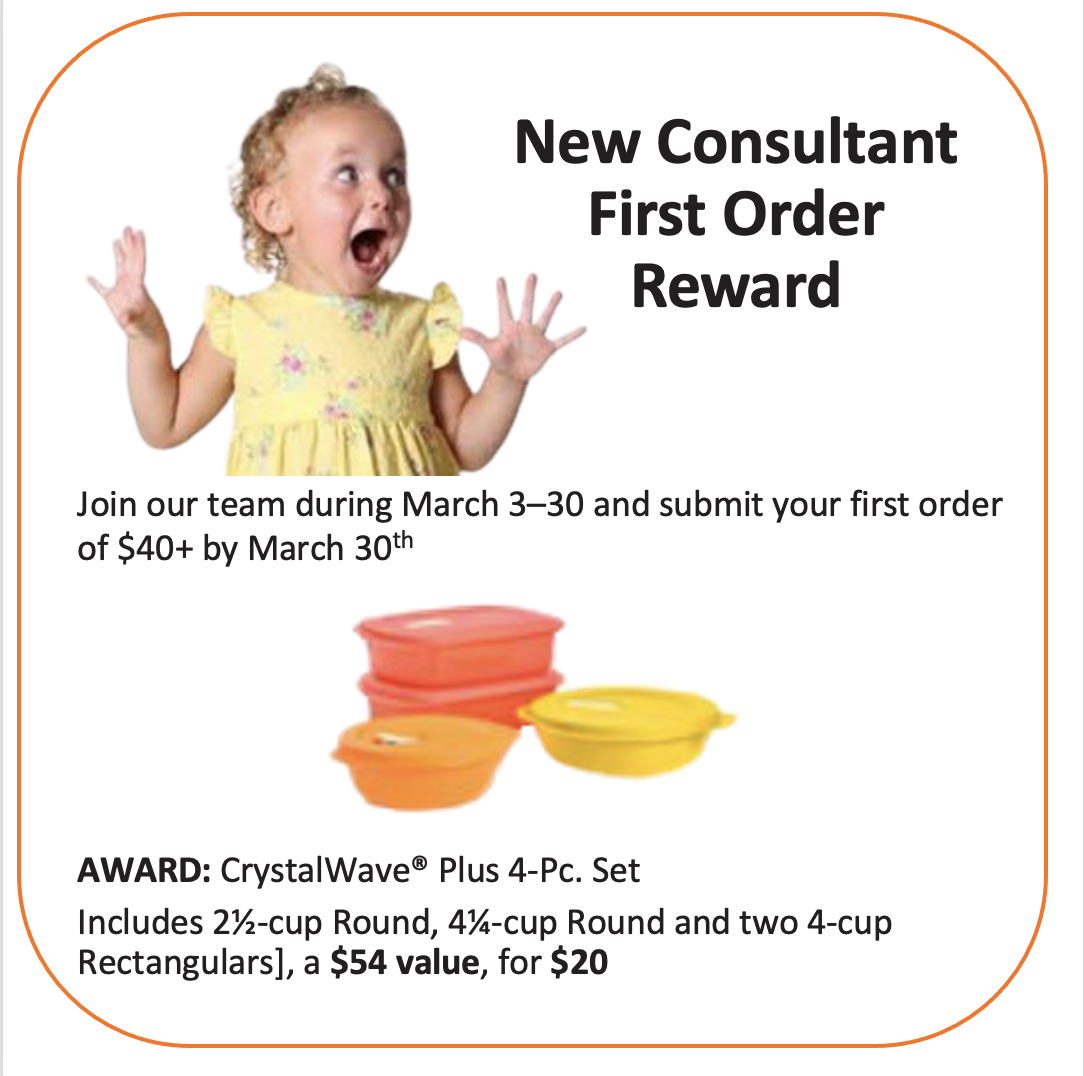 New Consultants that join in the first week of March (Feb 24-Mar 2) receive 8 pieces of Crystalwave for $15 when they submit $40 or more by March 30th. Those joining Mar 3-30 will still be rewarded with 4 pieces for $20 when they submit $40 or more by March 30th