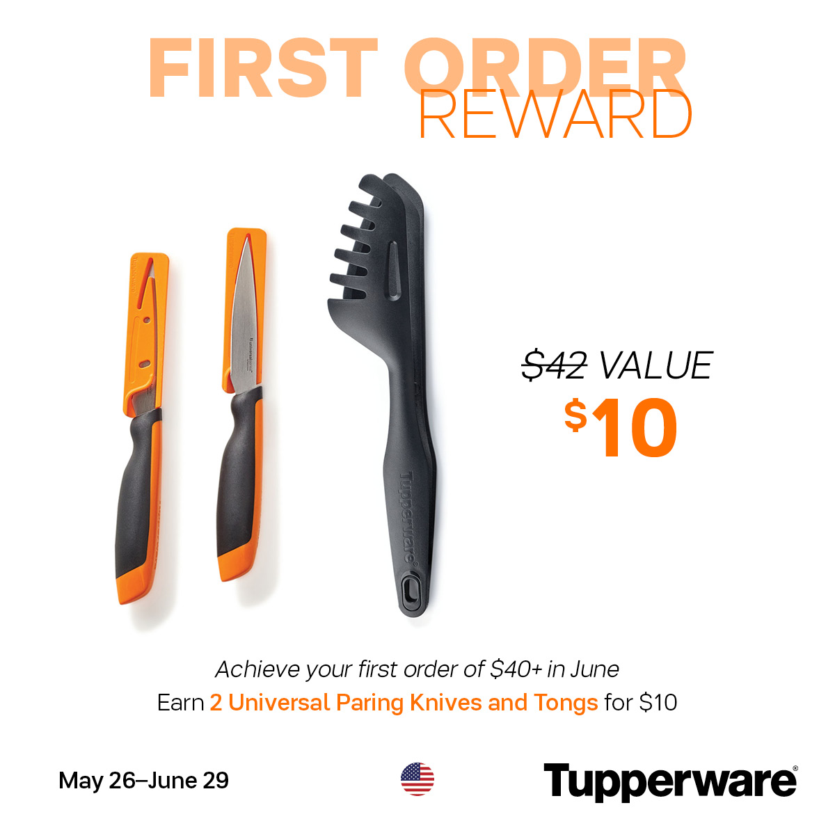 When our new team members activate their account with their first order of $40 or more, we have a great gift for them…The Universal Paring Knives and Tongs for $10!